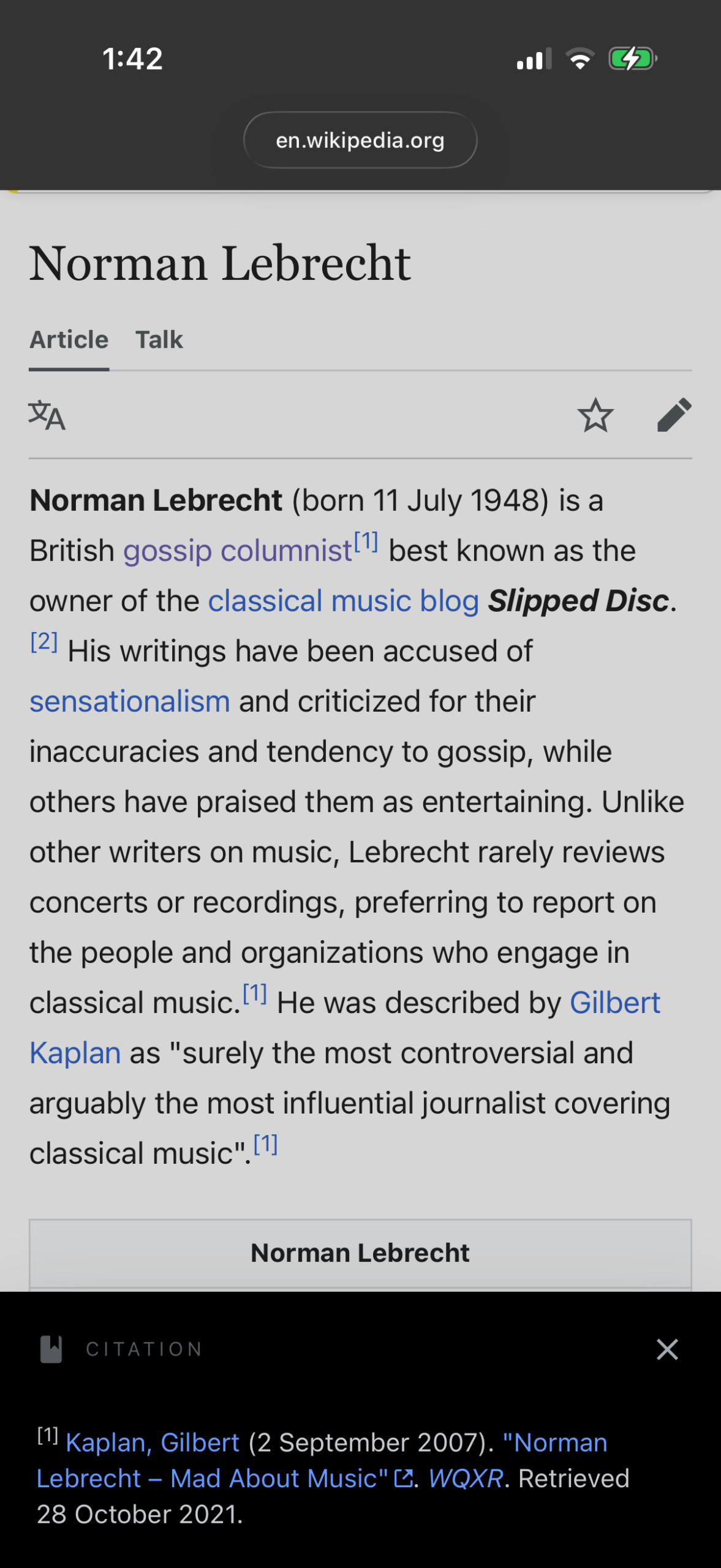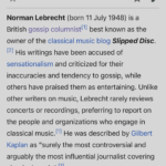 维基百科将诺曼·莱布雷希特描述为“八卦专栏作家”,这个标签似乎有些轻描淡写。我记不清在这次争论之前人们是如何称呼他的;维基百科一直在更新,其措辞几乎每秒钟都在变化。然而,仅仅将他贬低为八卦专栏作家,却忽略了他几十年来在古典音乐界的影响力。