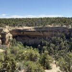 A great viewing point, looking out to multiple cliff dwelling villages, over the canyon, in the Mesa Verde national park. These dwellings used to be bustling communities. Over 30 cliff dwellings occupy these canyon alcoves and ledges.