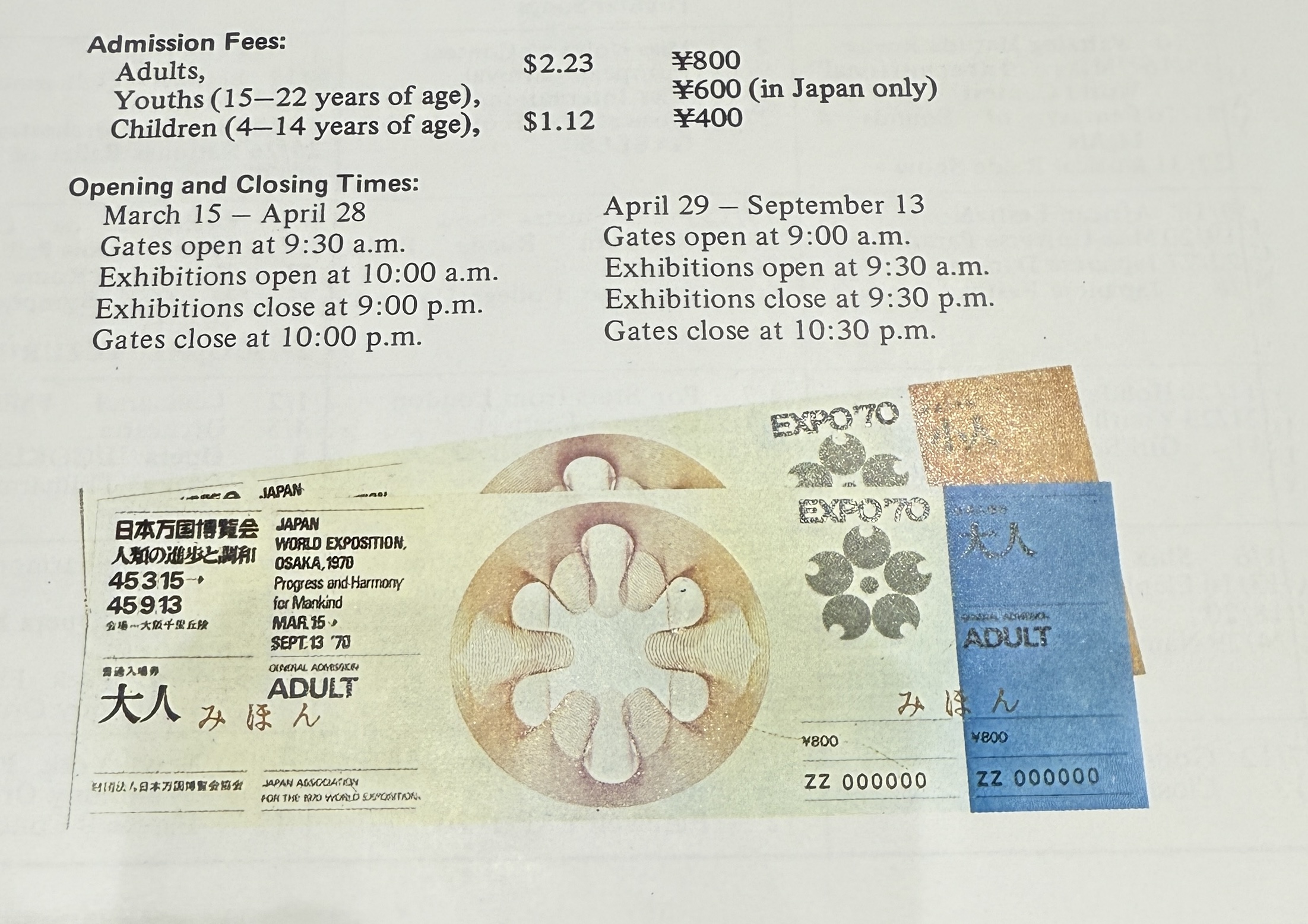Today, at our book club, re Erik Larson’s 2003 Devil in the White City, about World’s Columbian Exposition in Chicago 1893 (and the series killer Holms). One of the clubbers shared her trip to Osaka’s 1970 World Fair when she and her husband stationed in Japan. A ticket for adult then was $2.23 / ¥800.