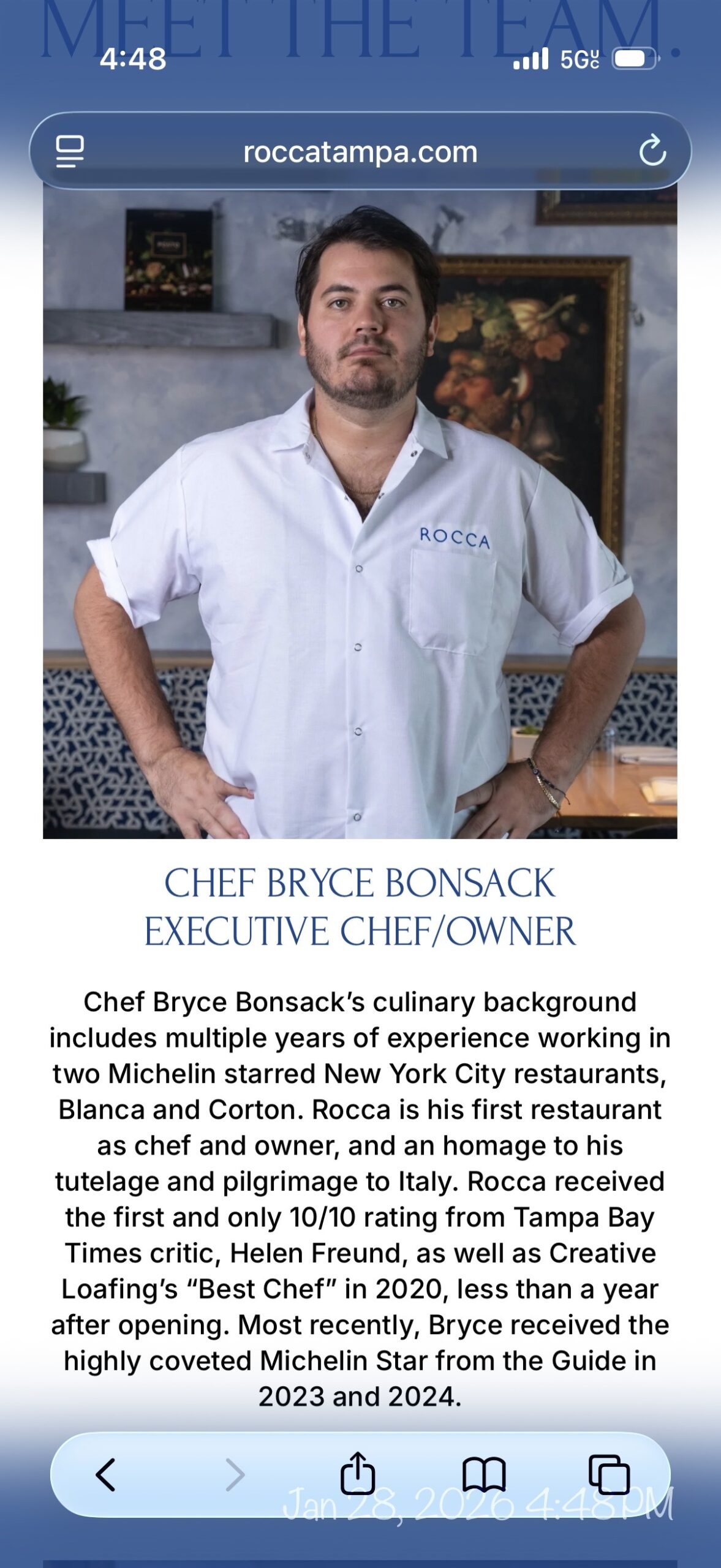 Background context: this is chef-owner Bryce Bonsack’s first restaurant. He trained at Italian kitchens and two Michelin-starred New York restaurants—Blanca and Corton. Tampa Bay Times critic Helen Freund (who profiled another restaurant, Hales Blackbrick frivolous lawsuit over my initial 3-star review last June) gave the restaurant a 10/10. Chef Bryce received Michelin stars in 2023 and 2024.
